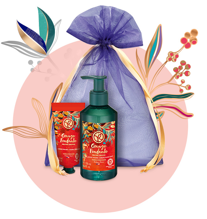 У наборі Апельсин у Шоколаді Гель для Миття Рук 190 мл та Крем для рук 50 мл у святковому мішечку.