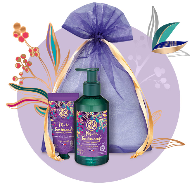 У наборі “Ожинова Насолода” Гель для Миття Рук 190 мл та Крем для рук 50 мл у святковому мішечку.