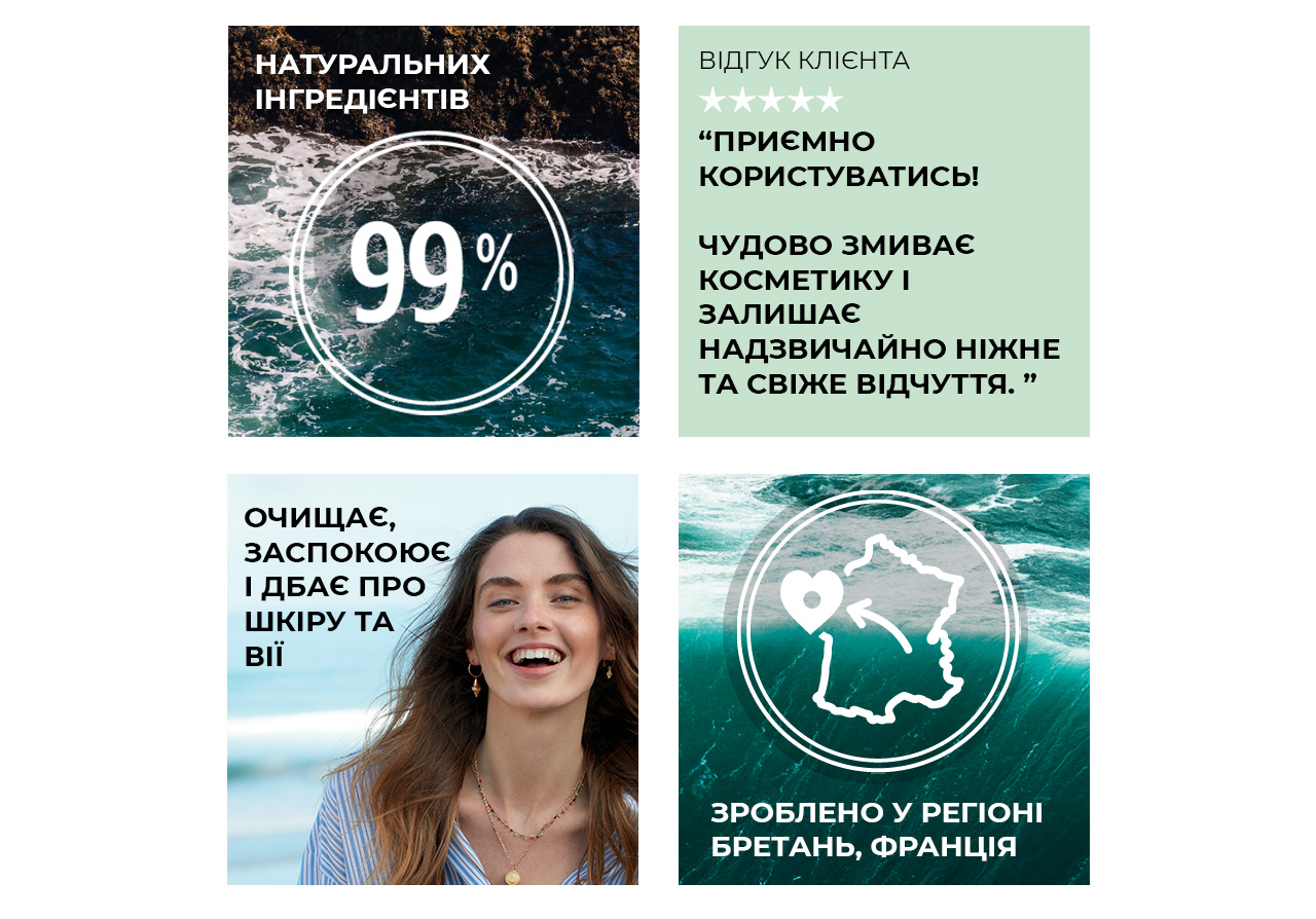 Желе-Демакіяж на основі мікроводоростей Тетраселміс, що мають унікальну здатність насичувати клітини киснем, делікатно видаляє макіяж, позбавляє токсинів та очищає шкіру обличчя та контуру очей. Засіб поєднує ефективність олії для зняття макіяжу та свіжість гелю для вмивання.