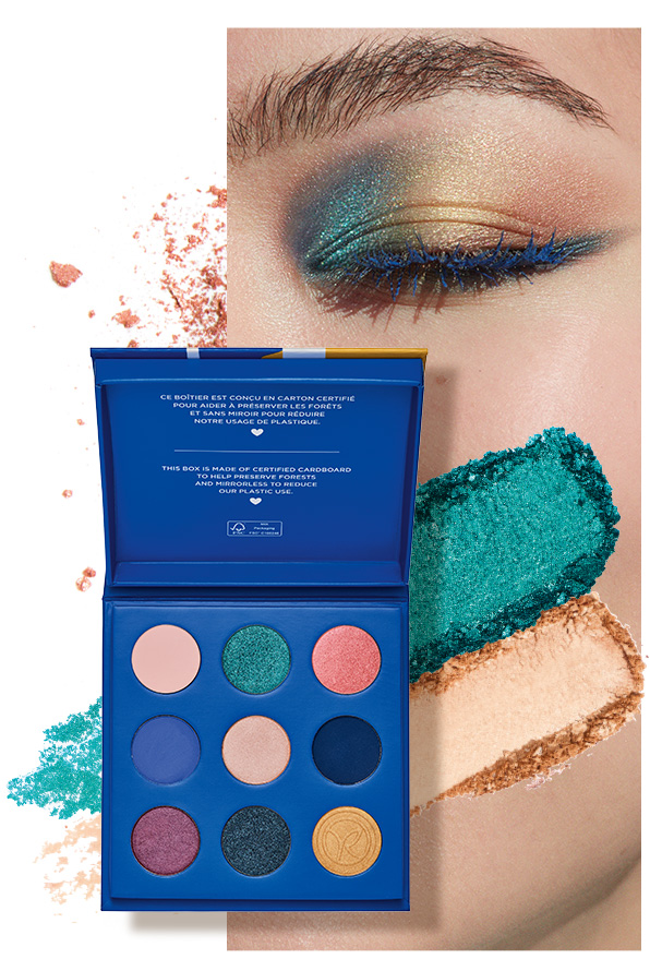 Тіні у відтінках від синього та бірюзового до рожевого і піщано-золотого мають насичений колір, а також три варіанти фінішу: матовий, перламутровий, металік. Їхня лагідна, веганська* формула збагачена екстрактом Волошки БІО, тому підходить для чутливих очей, у тому числі при носінні контактних лінз та синдромі сухого ока.