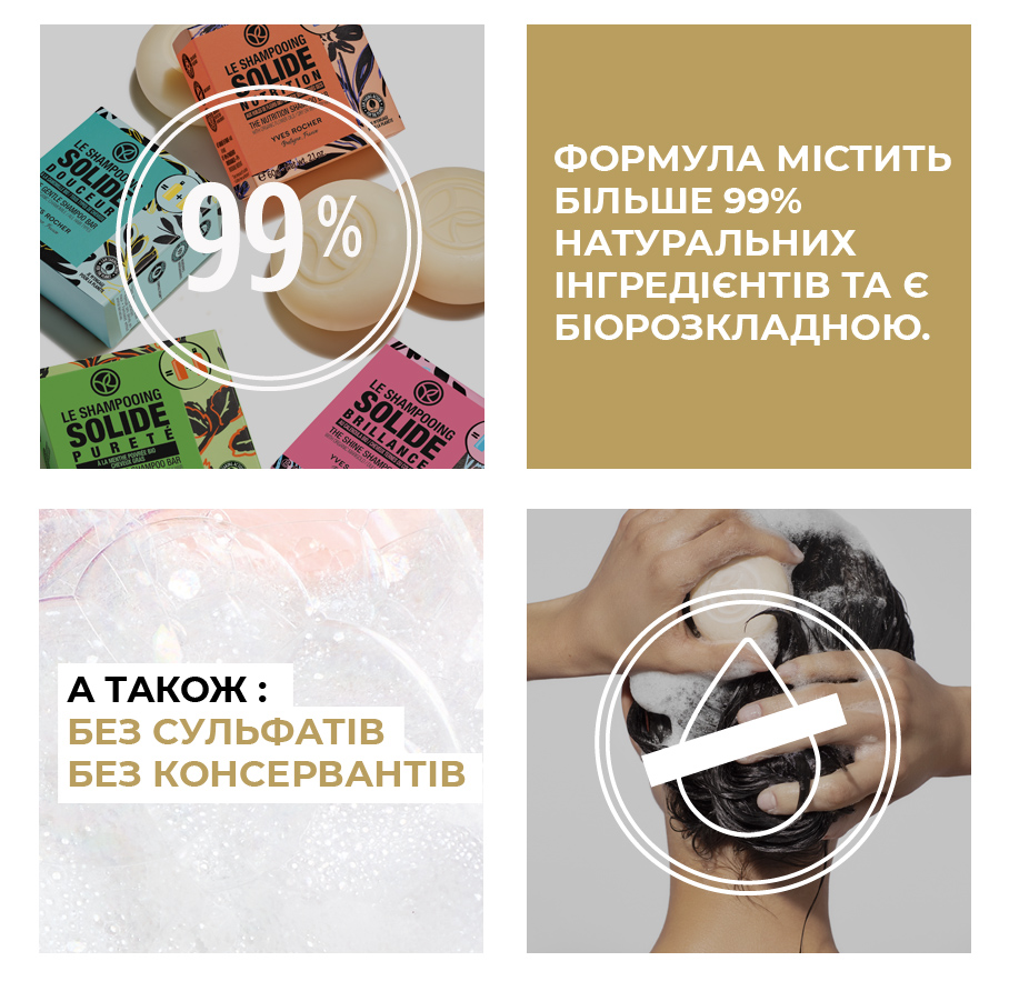 1 твердий шампунь 60 г замінює ~ 2 флакони стандартного рідкого шампуню Yves Rocher об’ємом 300мл*