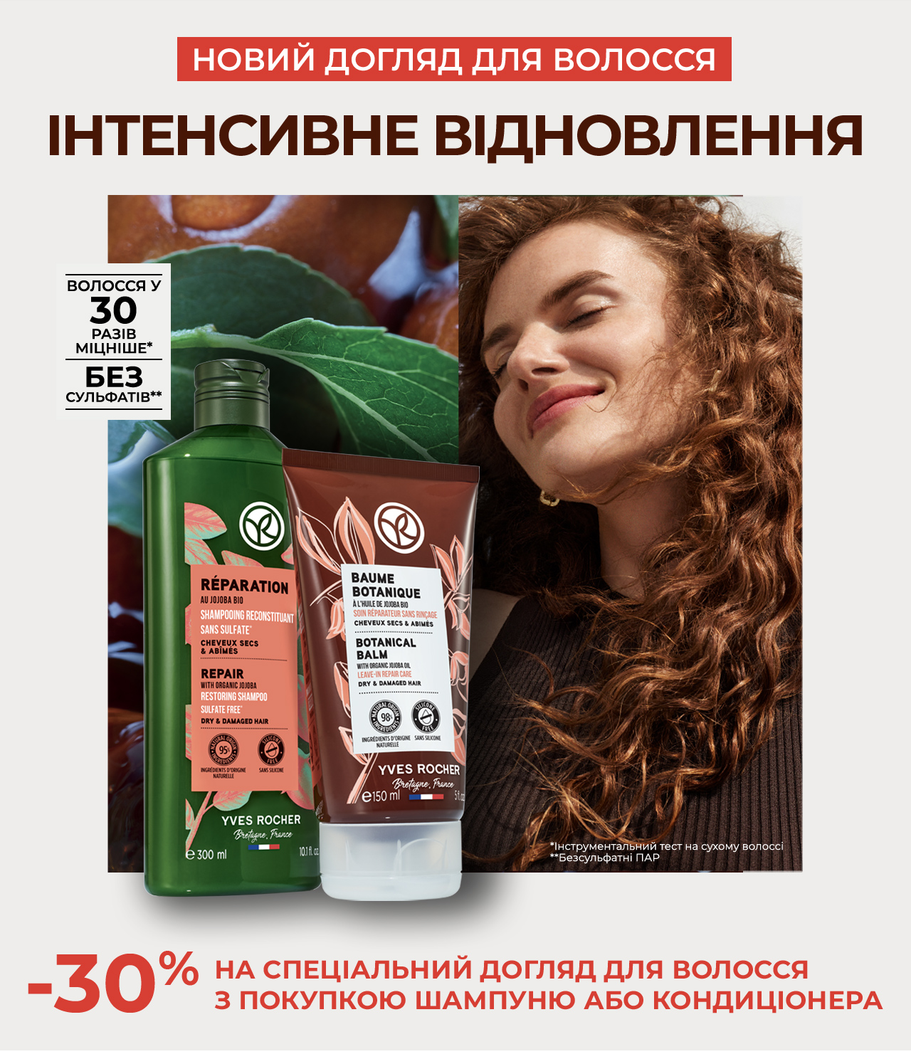 Такий глибокоживильний догляд потрібен волоссю, яке від природи схильне до сухості, часто плутається та погано розчісується. Щоб забезпечили високу ефективність гами, експерти Yves Rocher обрали унікальні за своїми властивостями олії – Жожоба, Авокадо та Кокоса.