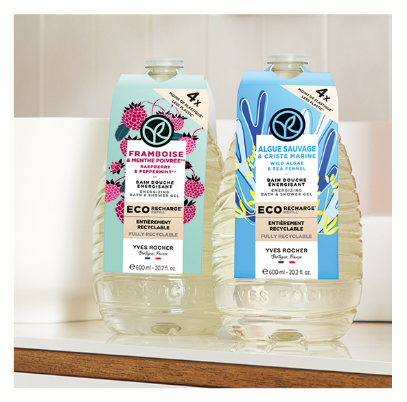 Флакон багаторазового використання Yves Rocher виготовлений з використанням переробленого пластику* та розрахований на заправку гелем для ванни та душу.