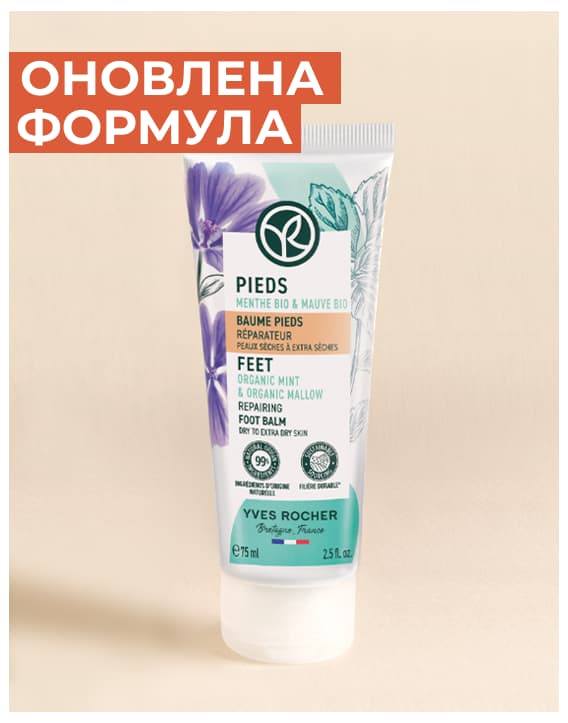 Відновлювальний бальзам для ніг, збагачений органічною М’ятою, органічною Мальвою та олією Каріте Біо забезпечує м’якість та комфорт.