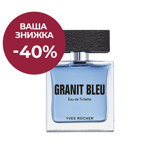 Пропозиція діє з 03.09.2025 по 30.09.2025 на сайті YVES-ROCHER.UA на території України, крім тимчасово окупованої території України та населених пунктів, на території яких органи державної влади тимчасово не здійснюють свої повноваження, та населених пунктів, що розташовані на лінії зіткнення. Пропозиція знижки розповсюджується на обрані товари. Приклад розрахунку ціни зі знижкою та співвідношення розміру знижки до попередньої ціни реалізації товару: Туалетна вода Granit Bleu 50мл - попередня ціна реалізації товару 1849,00 грн з ПДВ, знижка -40% становить 739,60 грн з ПДВ, ціна з урахуванням знижки 40% - 1109,40 грн з ПДВ. Під Подарунком мається на увазі надання знижки в розмірі вартості даного товару на придбання товарів за цією пропозицією (при виконанні умов пропозиції).